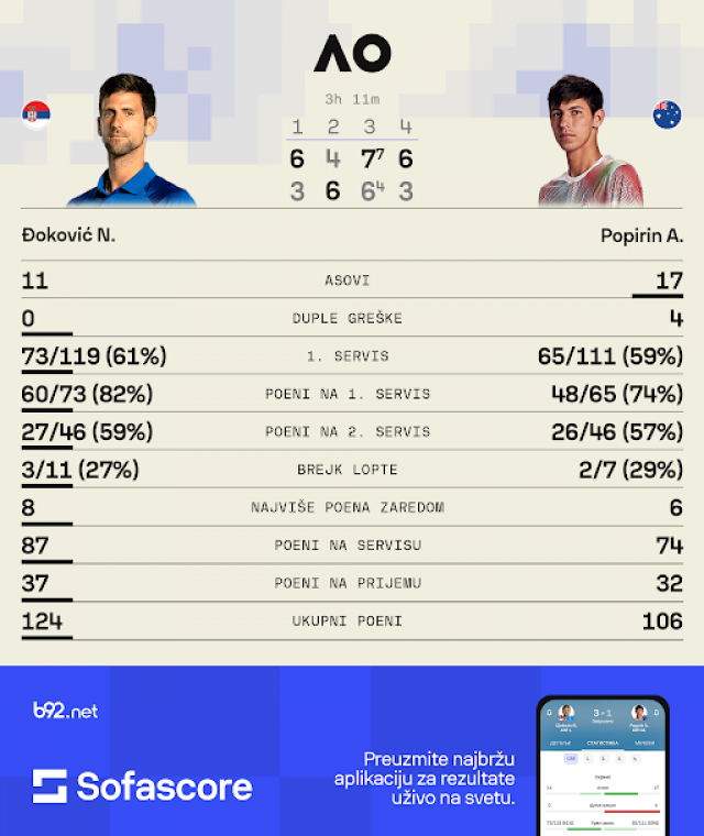 Naprotiv, 24-godišnji Australijanac se potpuno razigrao i od starta drugog seta pogađao vinere, servirao izuzetno i "napadao" servis Đokovića.