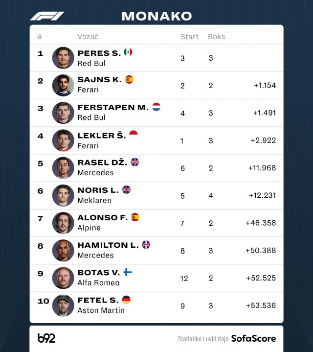 Podsećamo, Peres je startovao sa pete pozicije i uz pomoć niza velikih grešaka ljudi iz Ferarija domogao se prvog mesta i nije ga ispuštao.