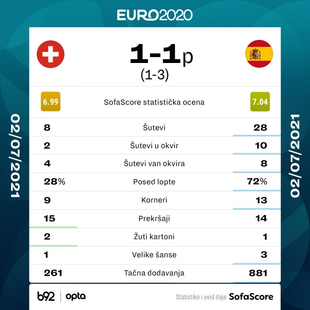 Španija je u polufinalu Evropskog prvenstva, nakon pobede nad Švajcarskom 3:1 posle penala.