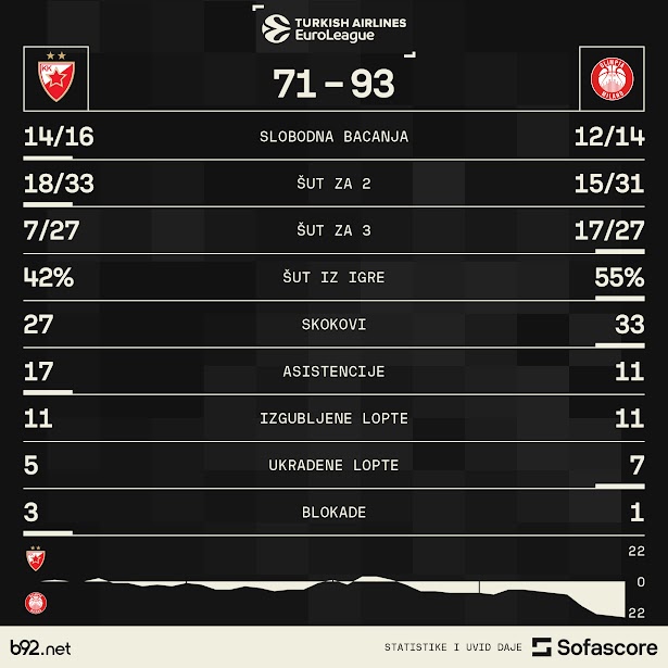Košarkaši Crvene zvezde izgubili su od Armanija 93:71 u 10. kolu Evrolige u Štrak areni.