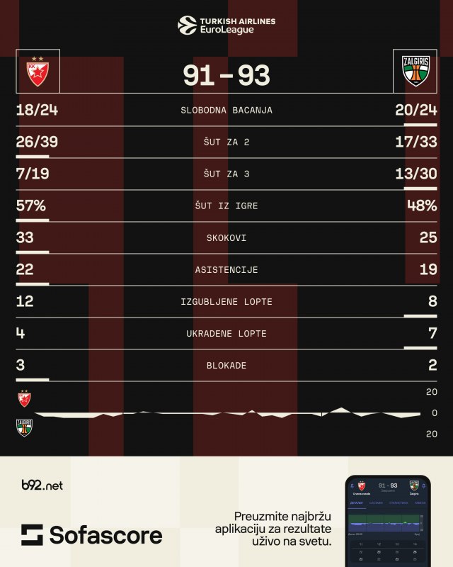 Obe ekipe defanzivno nisu uspele da ispune svoj zadatak, što govori 90+ poena i kod jednih i drugih. Zvezda je imala problema, najviše sa preuzimanjem, kada su u igri Jago Dos Santos i Nemanja Nedović, što je Žalgiris dobro koristio i "kažnjavao" takve situacije.
