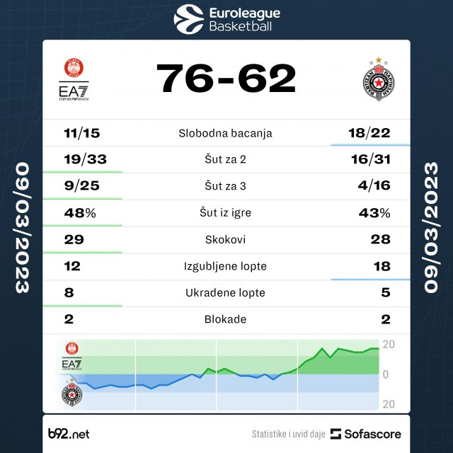 Košarkaši Partizana poraženi su protiv Olimpije u Milanu rezultatom 76:62 u okviru 28. kola Evrolige.