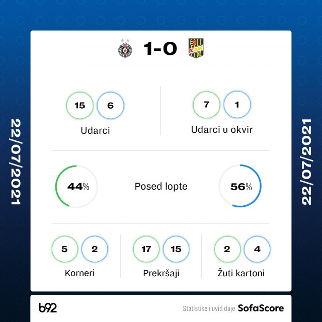 Poslednjih dvadesetak minuta utakmice nije bilo atraktivno i Partizan je dobio opomenu od Dunajske Strede, Slovaci su pokazali da mogu da odolevaju njihovim napadima i uspeli da sačuvaju mrežu u drugih 45 minuta.