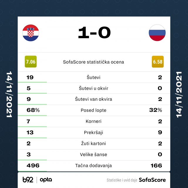 Fudbalska reprezentacija Hrvatske pobedila je Rusiju 1:0 (0:0), u poslednjem meču grupe H i plasirala se direktno na Svetsko prvenstvo u Kataru.