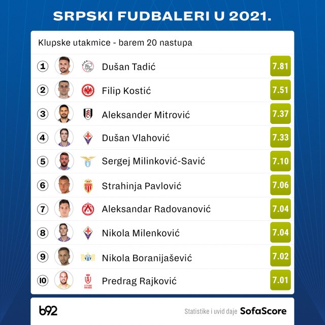 Na trećem mestu je golgeter Fulama Aleksandar Mitrović (7,37), a odmah iza njega kolega iz napada i biser Fiorentine Dušan Vlahović (7,33).