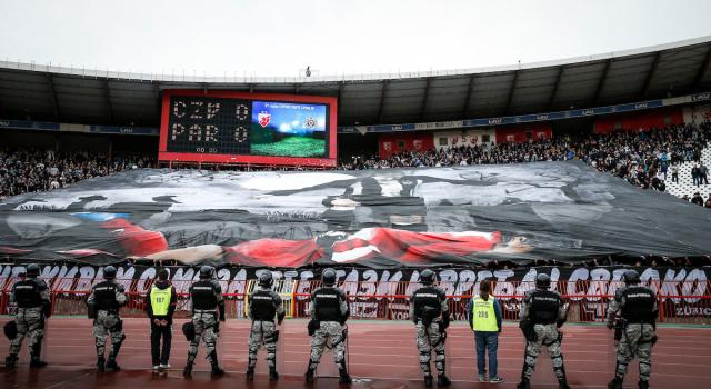 "Grobari" su razvili transparent na kojoj je prikazan bivši igrač Partizana Srđa Knežević kako gazi napadača crveno-belih Dejana Lekića.