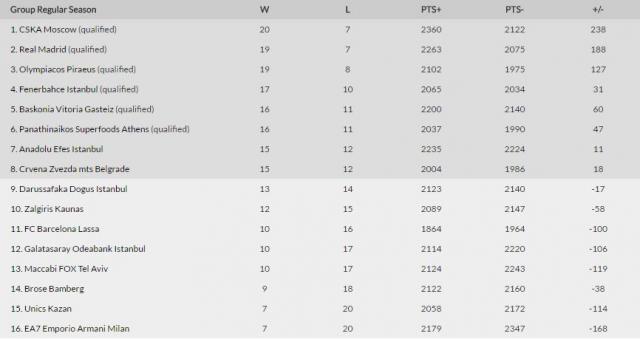 Isti učinak, ali i bolji međusobni skor od Zvezde ima Efes, dok su ispred Panatinaikos i Baskonija sa 16 trijumfa i 11 poraza.