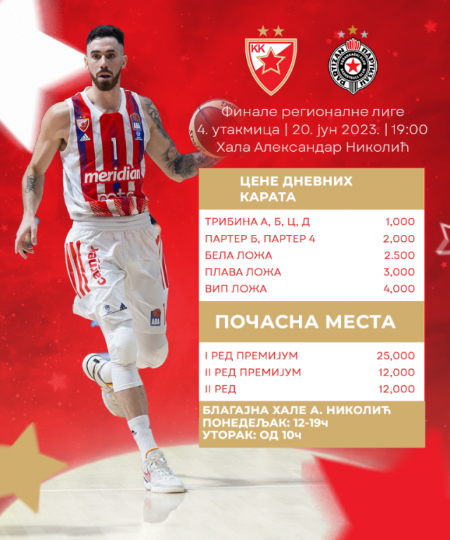 Košarkaški klub Crvena zvezda saopštio je da će u ponedeljak u 12 časova početi prodaja ulaznica za četvrti meč finala plej-ofa ABA lige protiv ekipe Partizana.