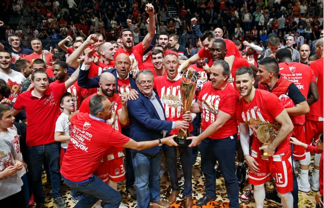 Košarkaši Crvene zvezde su osvojili šampionsku titulu u ABA ligi pobedom nad ekipom Budućnosti u petom meču finalne serije plej-ofa rezultatom 97:54.