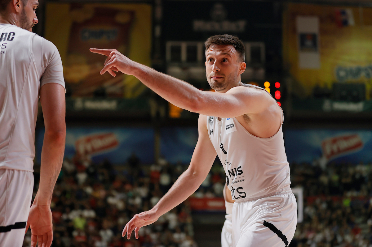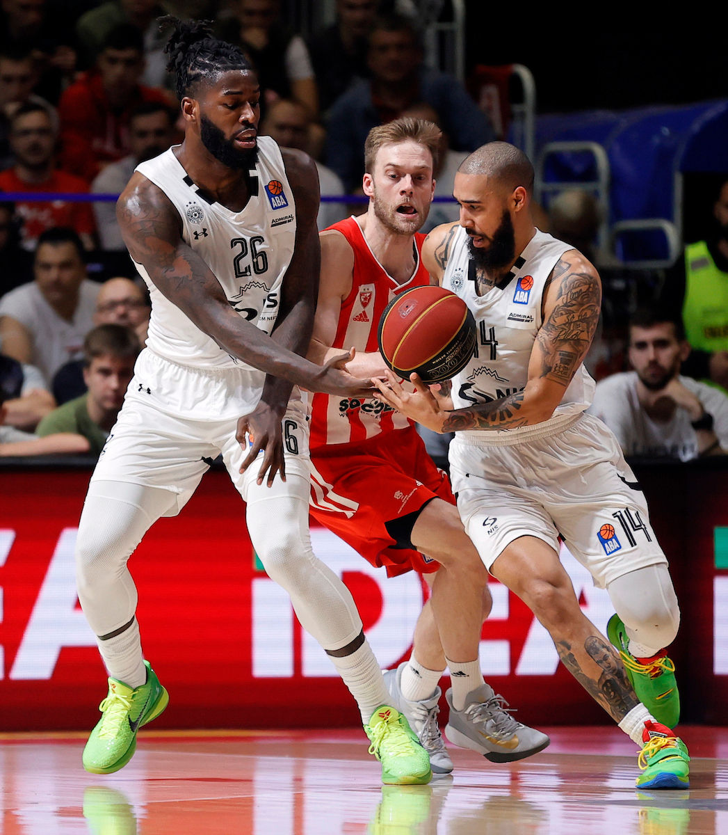 Loša komunikacija odbrane Partizana. MVP ABA lige je ostao sam na šutu za tri poena i ne propušta priliku da donese svojoj ekipi prve poene i vođstvo.