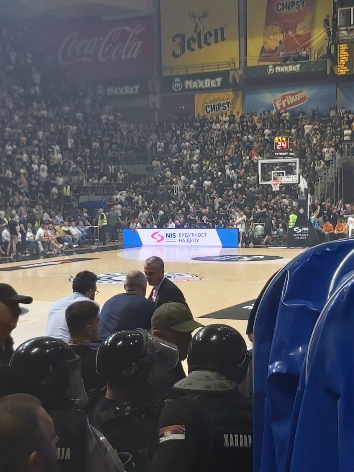Ukoliko će se meč nastaviti, najpre je potrebno da se isprazni deo tribina iza Zvezdine klupe, kao i onaj iza levog koša koji trenutno napada Partizan.
