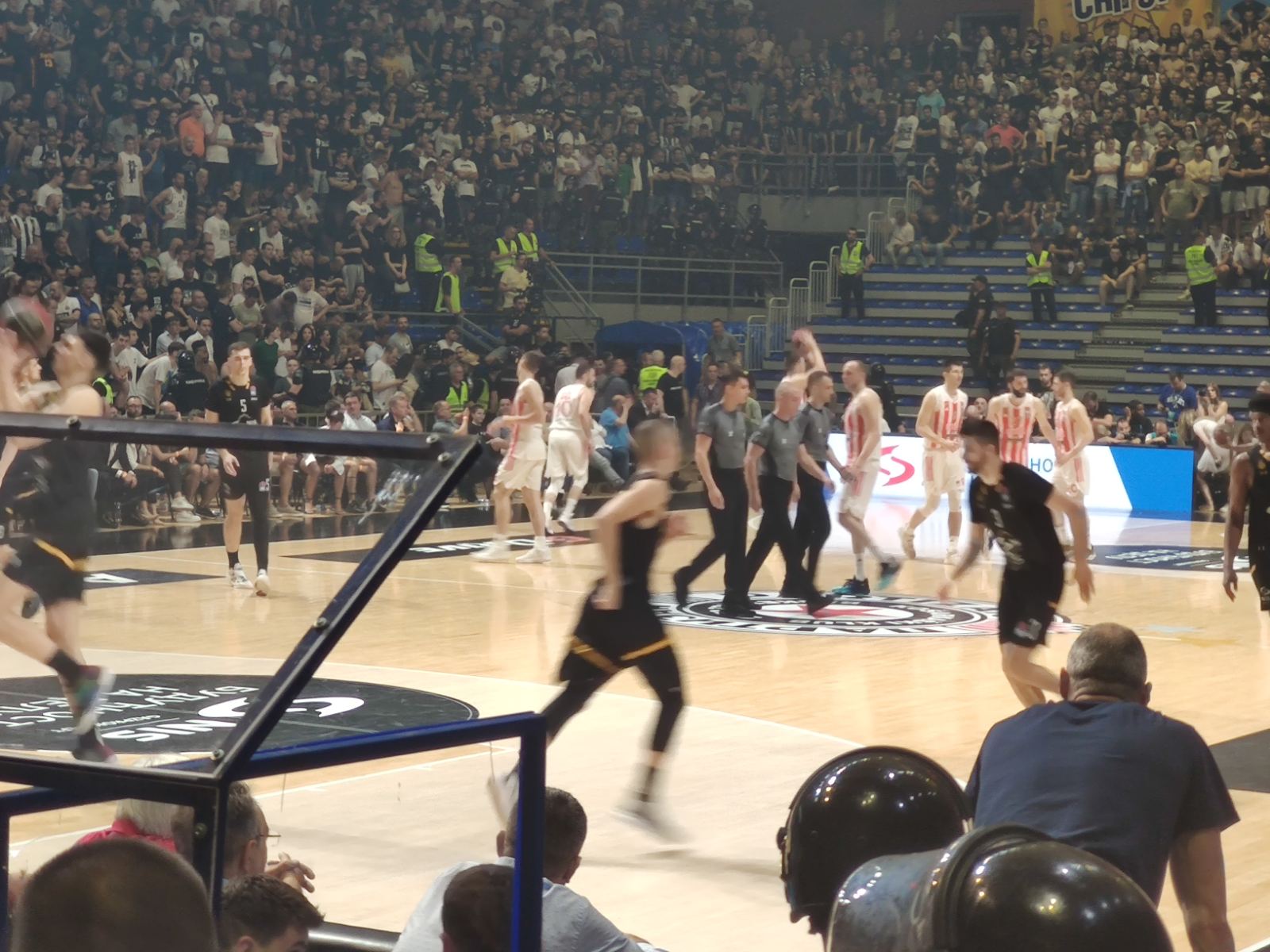 Izgleda da će pražnjenje tribina potrajati, pa su igrači otišli u svlačionice. Igrači Partizana su čuvali košarkaše Zvezde, kao što su i oni njih u drugom meču.