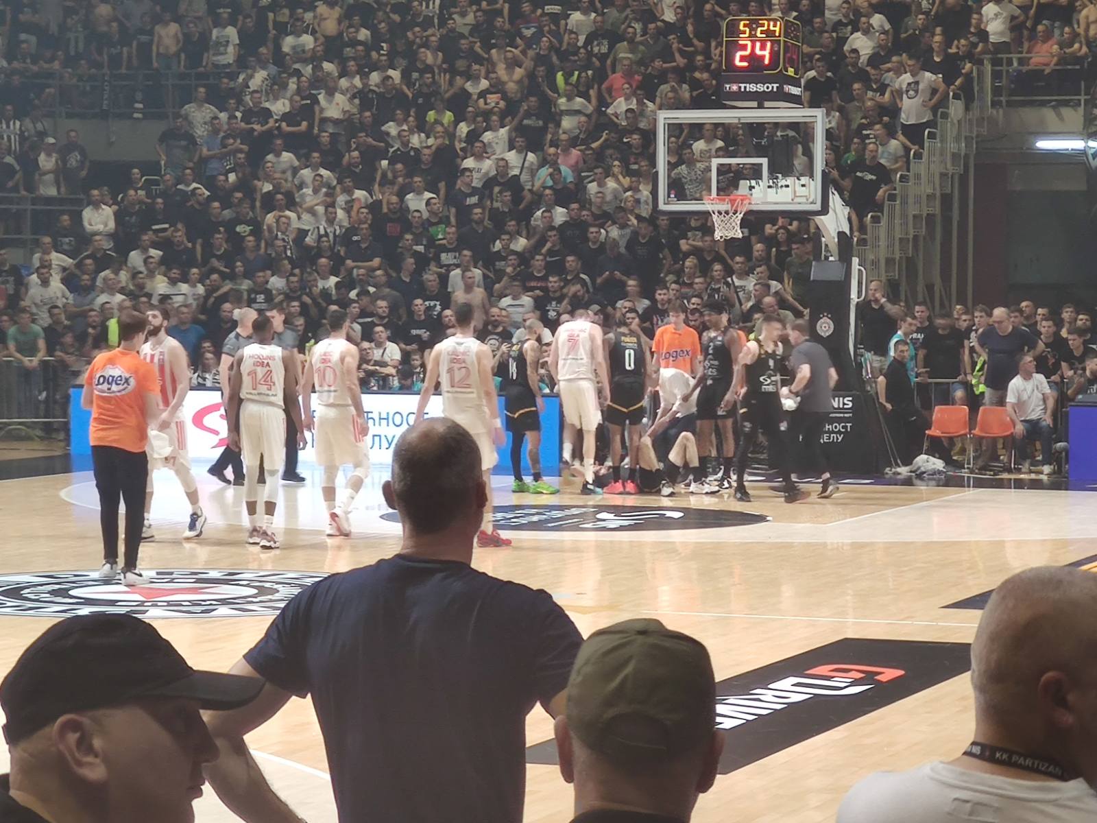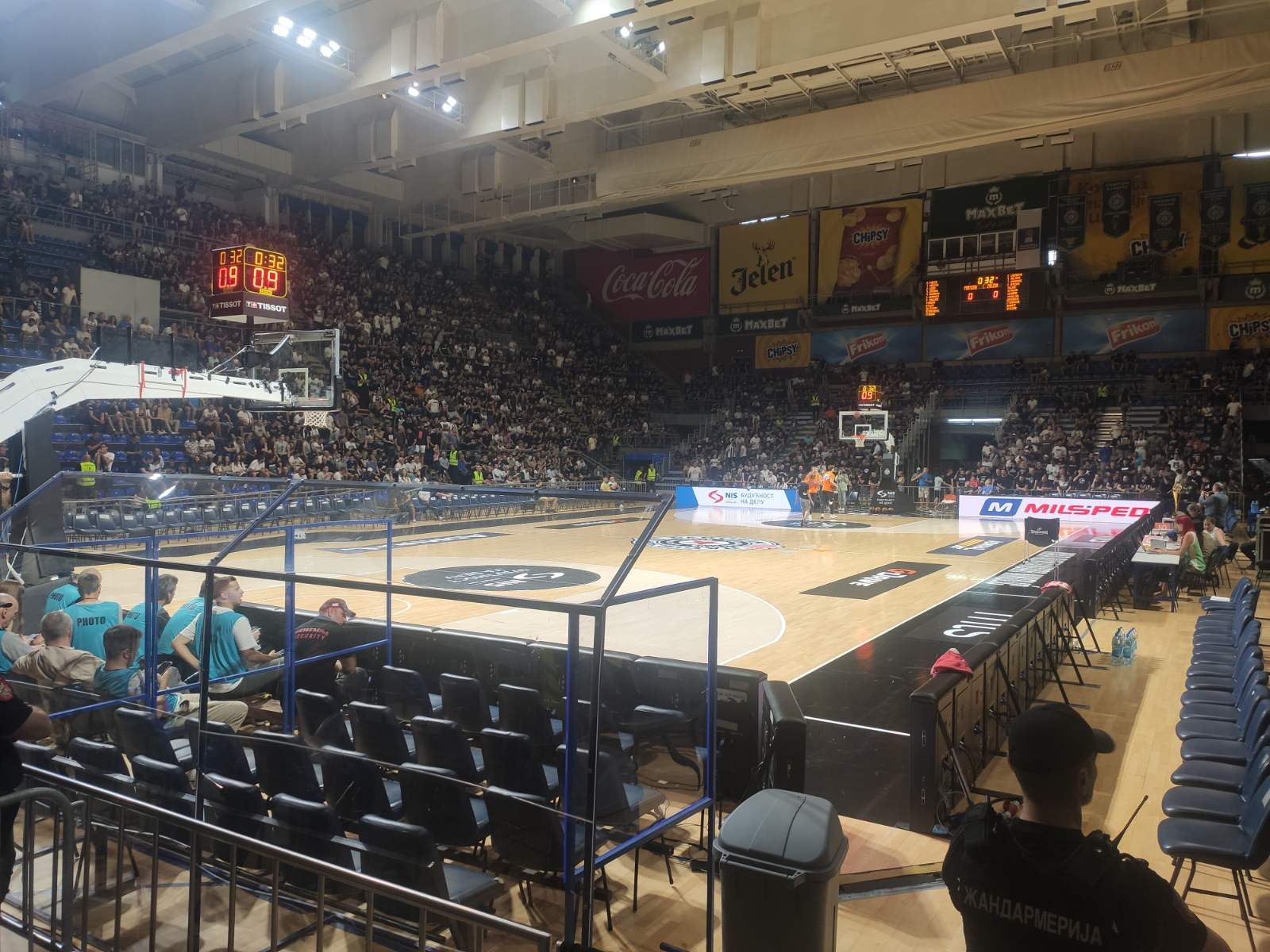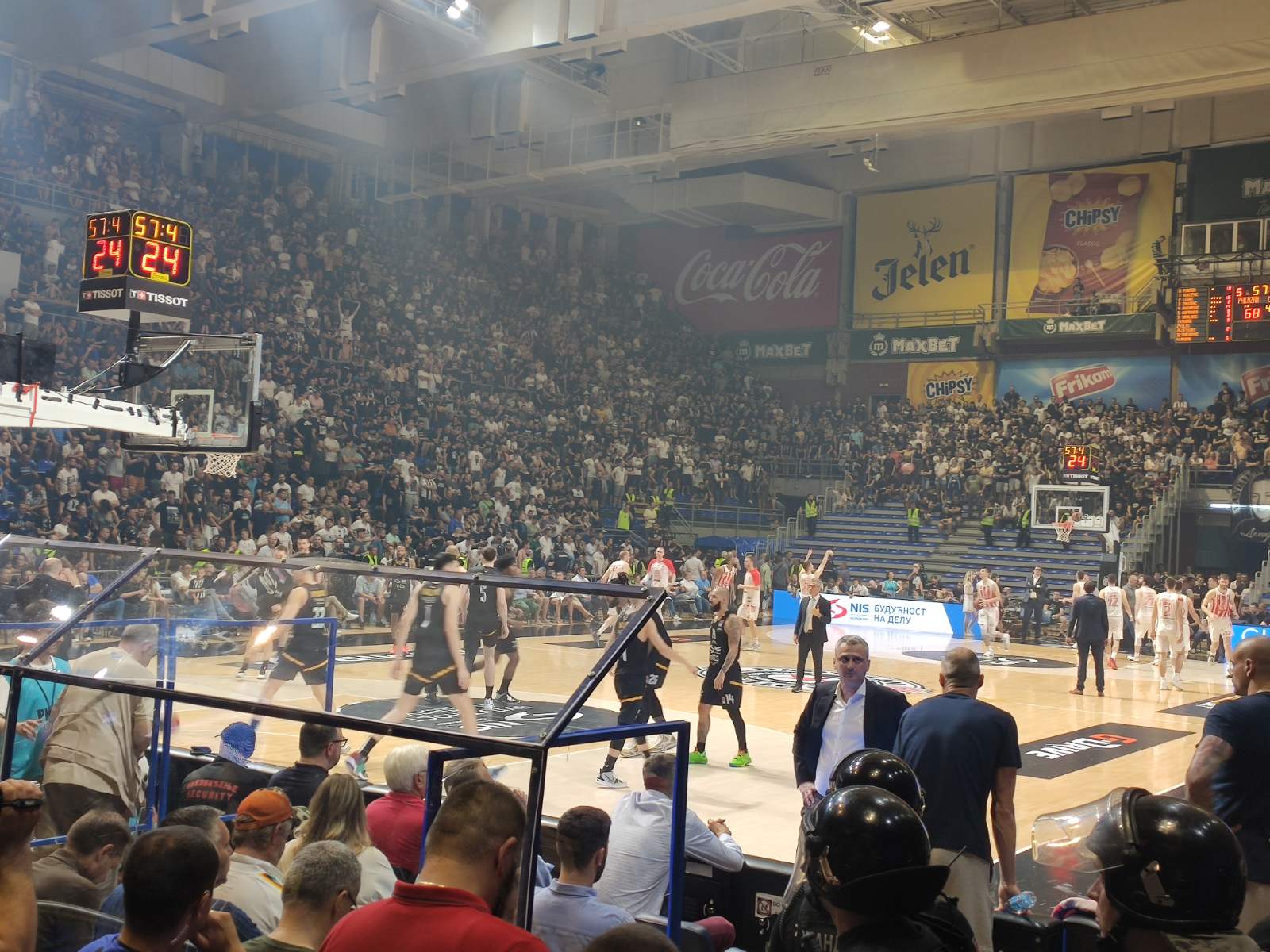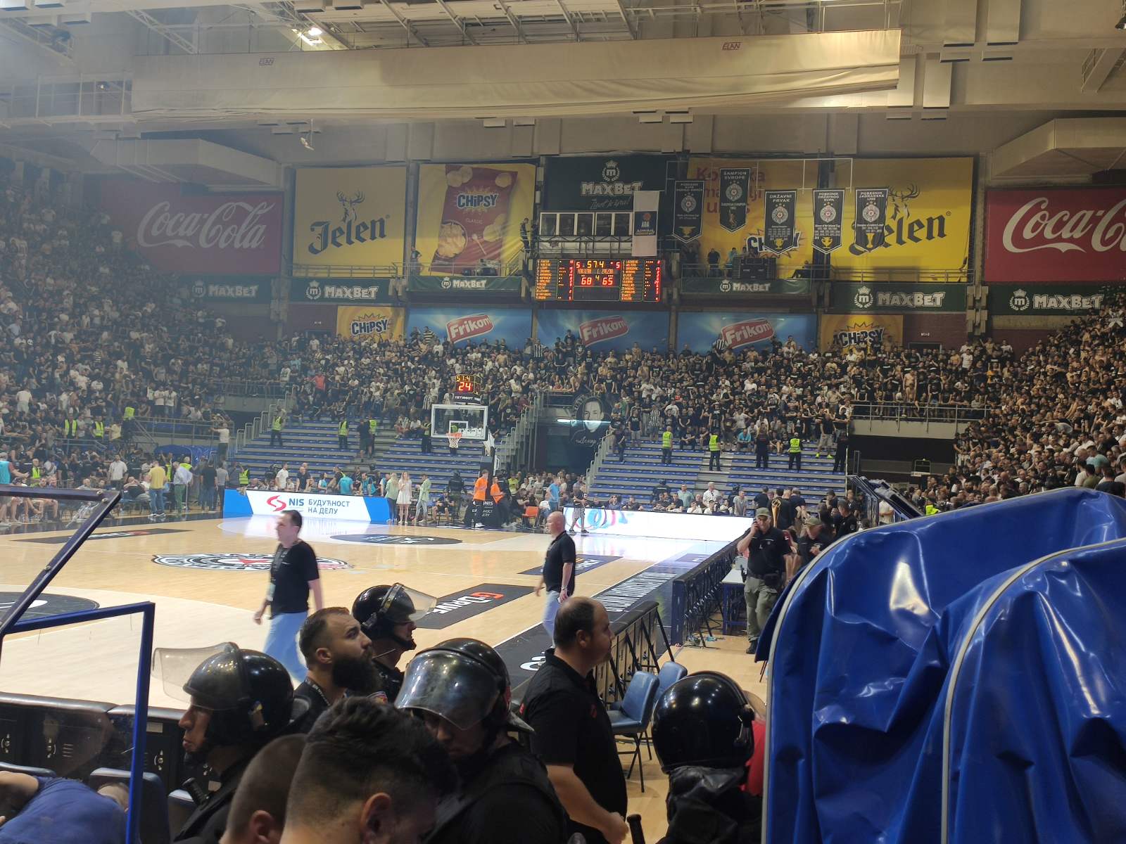 Sudije su izašle sa terena zbog ubacivanja predmeta nakon velikog broja upozorenja. Na parket su ušli pripadnici žandarmerije, a do tada je meč prekinut. Na satu je ostalo 57 sekundi.