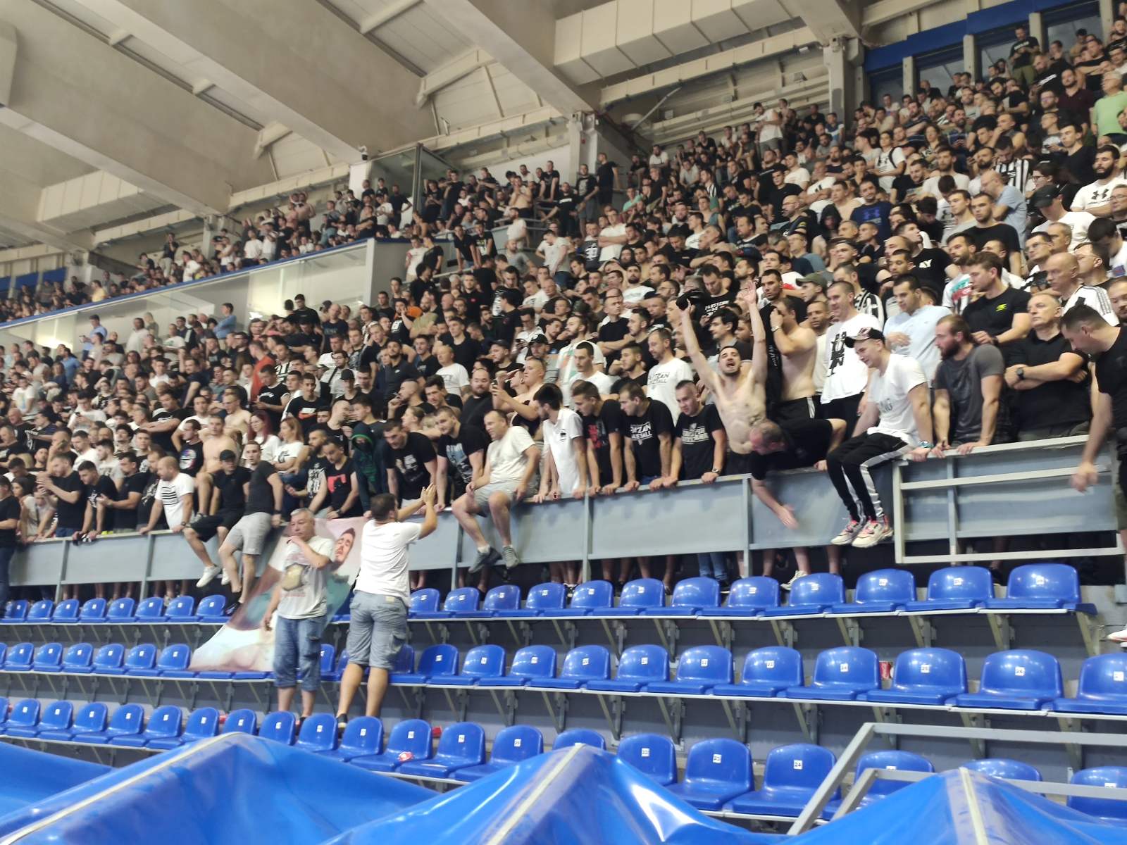 Navijači iza koša koji napada Partizan izlaze iz "Pionira". Tačnije, više izgleda kao da se samo povlače ka gornjim redovima.