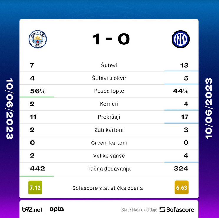U finalu Lige šampiona na stadionu "Ataturk" u Istanbulu Mančester siti je savladao Inter rezultatom 1:0 (0:0).