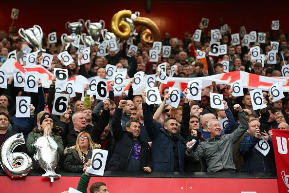 Navijači Liverpula pokazuju domaćim navijačima da su vlasnici šest trofeja Lige šampiona.