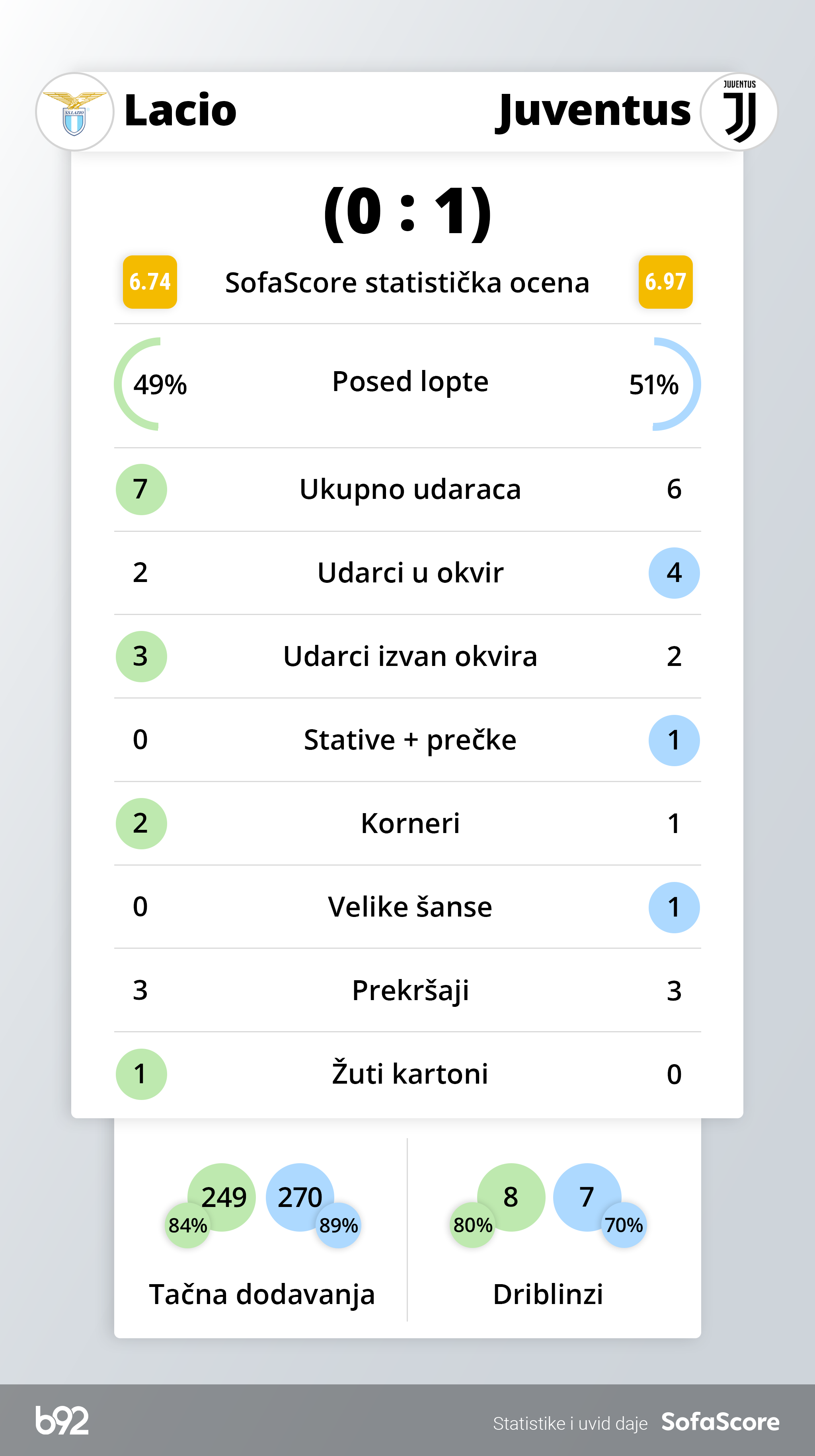 Fudbaleri Lacija i Juventusa odigrali su 1:1 u sedmom kolu Serije A.