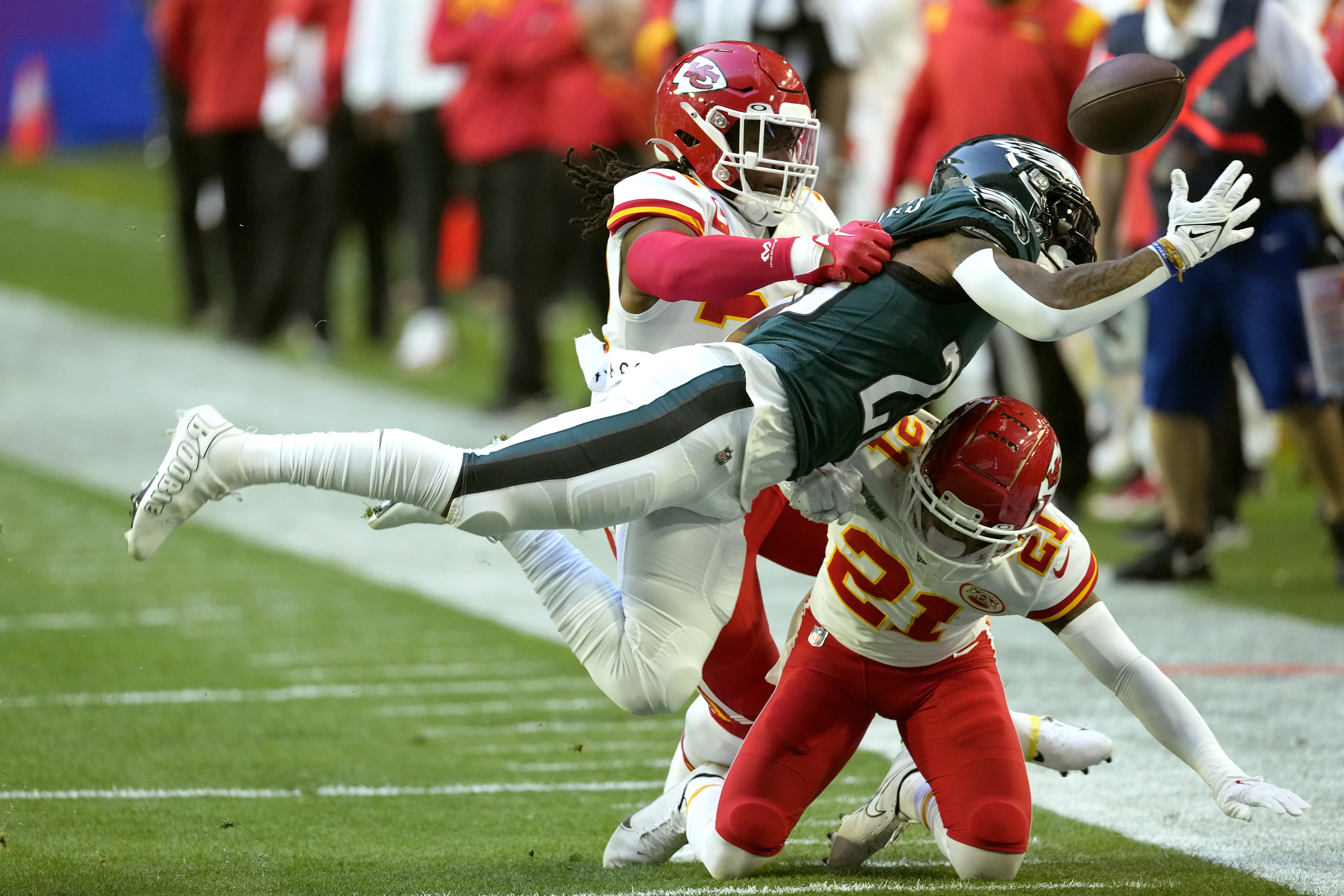 Devonte Smit hvata precizno dodavanje Džejlena Hurtsa i dolazi do manje od 10 jardi od end zone Čifsa. Ovom prilikom se Smit i povredio pošto je dobio udarac u koleno...