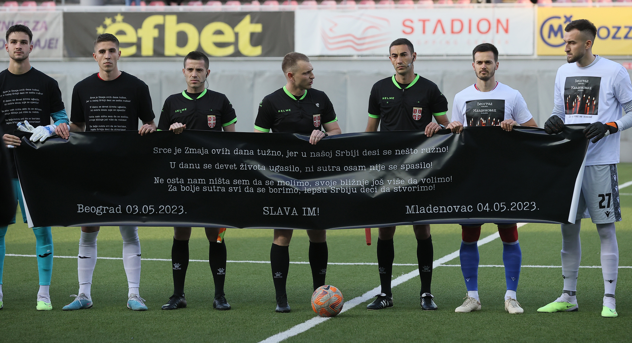 Fudbaleri Crvene zvezde su odali poèast žrtvama stradalim u tragedijama koje su zadesile Srbiju prethodne nedelje. Naši prvotimci su na teren pred utakmicu sa ekipom Voždovca izašli u majicama kako bi se i na taj naèin oprostili od stradalih i pružili podršku njihovim porodicama. pic.twitter.com/EMav7XSyQA