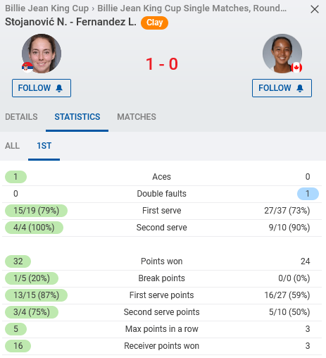 Istom merom joj je uzvratila i rivalka, greškom, tako da je Nina stigla do nove brejk lopte. Ipak, Fernandez je odigrala fantastičan pasing, a potom i forhend paralelu.