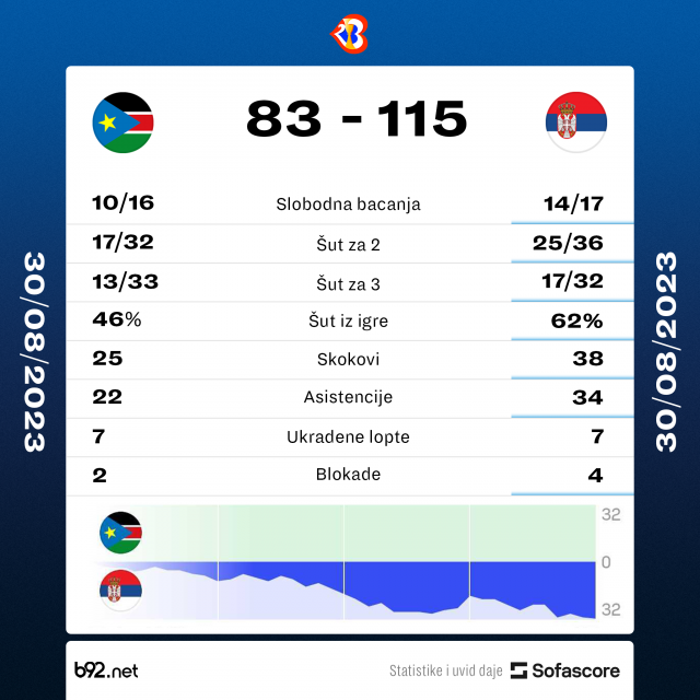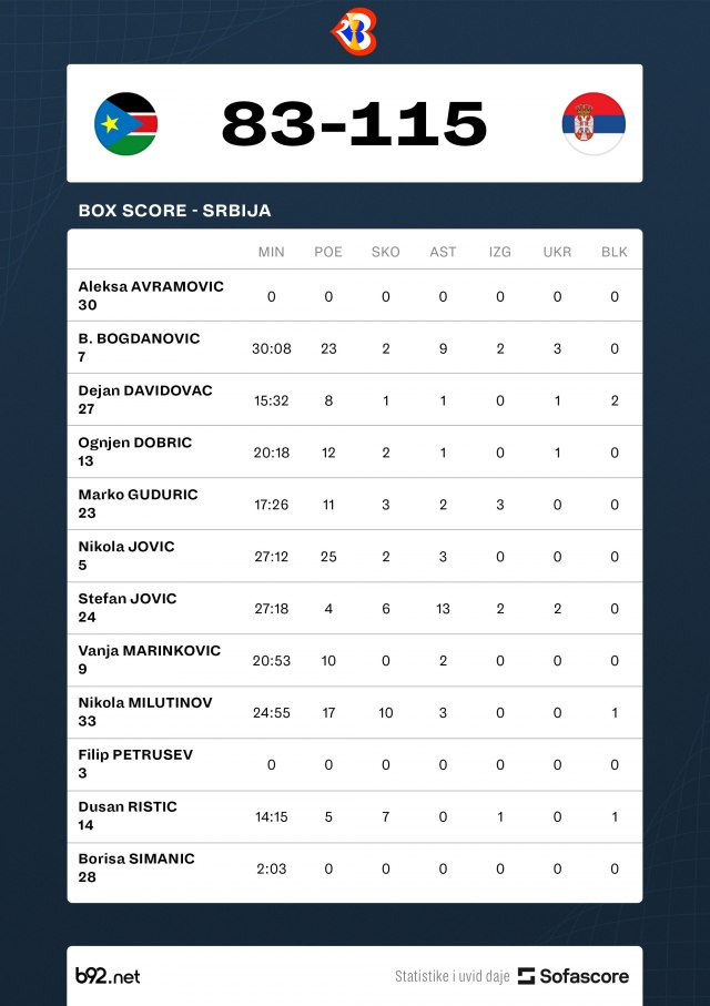 Srbija je imala čak 38 skokova, 34 asistencije, 7 ukradenih i svega 9 izgubljenih lopti, dok su imali 17 trojki i samo tri promašena slobodna bacanja.