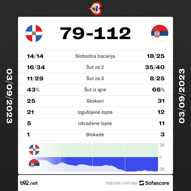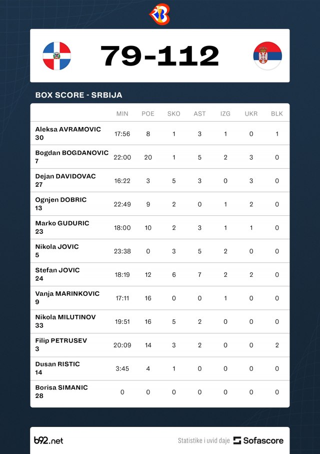 Košarkaši Srbije pobedili su Dominikansku Republiku rezultatom 112:79 u drugom meču druge faze Mundobasketa.
