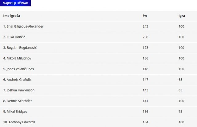 Inače, SGA je svojevrsni MVP našeg "Virtuelnog selektora" sa 243 poena, ispred Luke Dončića sa 208 i Bogdana Bogdanovića sa 173, dok je četvrti najkorisniji igrač bio Nikola Milutinov sa 156.