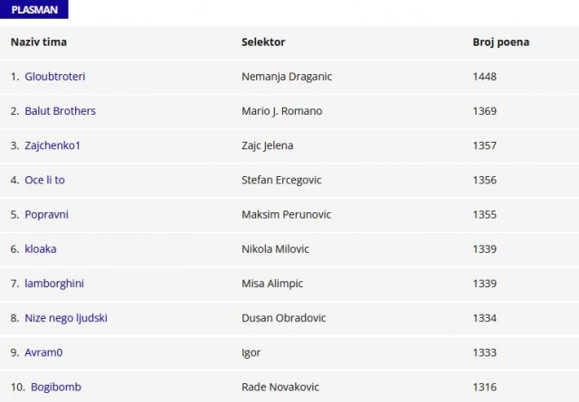 Iza sebe je ostavio "Balut Brothers" Marija J. Romana sa 1.369 i "Zajchenko1" Zajc Jelene sa 1.357.