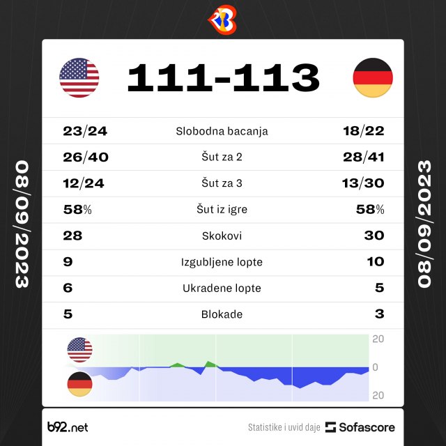 Nemci ubacuju 35 poena u trećoj četvrtini i prave ključnu razliku koja im je potom donela miran ulazak u poslednju četvrtinu. Kako se utakmica bližila kraju, tako su Amerikanci topili prednost Nemaca.