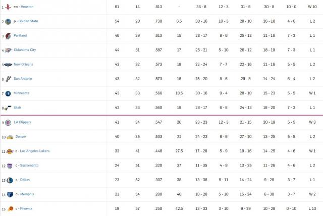 Ekipa Tima Tibodoa zabeležila je 43. trijumf u svom 76. susretu u sezoni, odnosno nalazi se na sedmom mestu Zapada, sa dva trijumfa više od devetoplasiranih Los Anđeles Klipersa, ali i samo jednim manje od četvrtoplasiranog Oklahoma Siti Tandera.