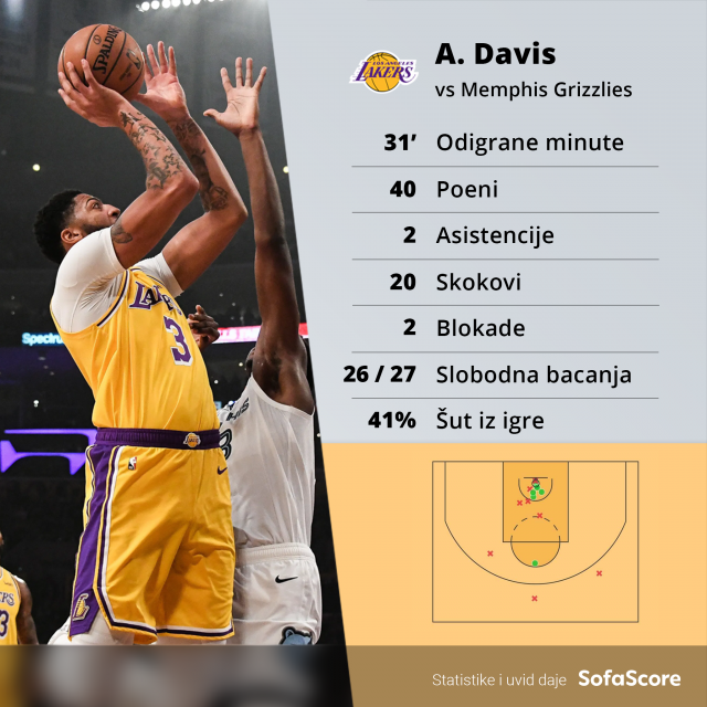 Lejkersima je ubedljiv trijumf u "Stejpls centru" doneo fantastični Entoni Dejvis, koji je za 30 minuta na terenu zabeležio čak 40 poena i 20 skokova, a dodao je i dve asistencije.