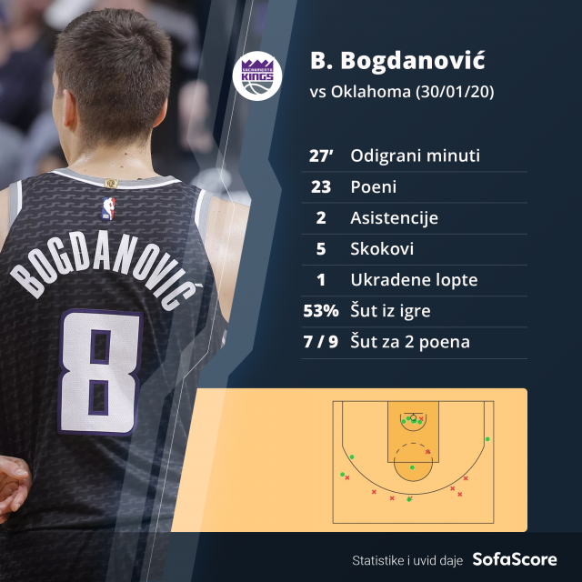 Nemanja Bjelica je promašio svih pet šuteva iz igre i meč je zvaršio samo sa pet asistencija, dok je Bogdana najbolje pratio Dieron Foks sa 19 poena i pet uspešnih dodavanja.