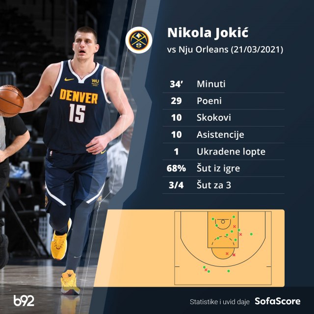 Jokić je upisao 29 poena (10/15 za dva, 3/4 za tri), 11 asistencija, 10 skokova i po ukradenu loptu i blokadu, za 34 minuta na parketu.