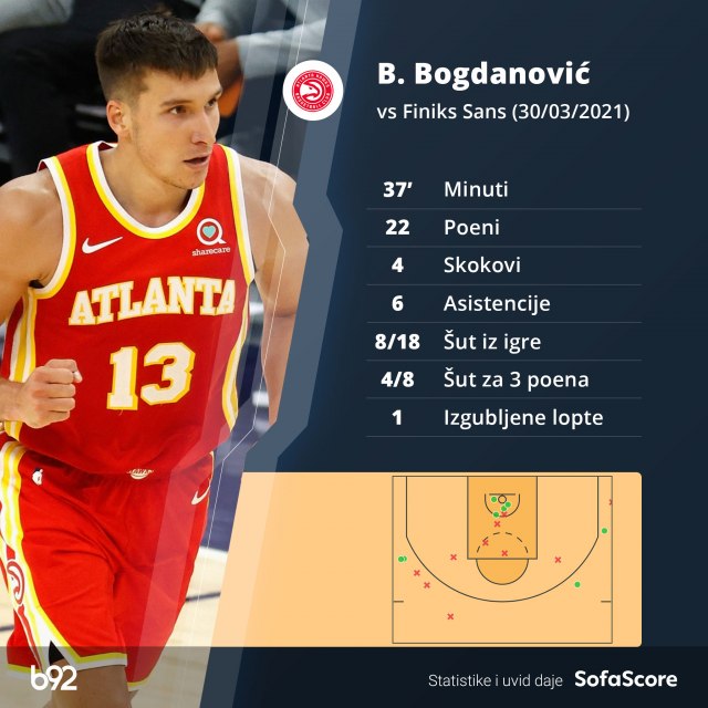 Od Bogdanovićevih saigrača jako dobri su bili Tre Jang sa 19 poena i 13 asistencija, odnosno Klint Kapela sa po 16 poena i 16 skokova.