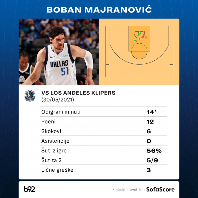 Na parketu je proveo ovoga puta oko 15 i to mu je bilo dovoljno da postigne 12 poena i sakupi šest skokova.