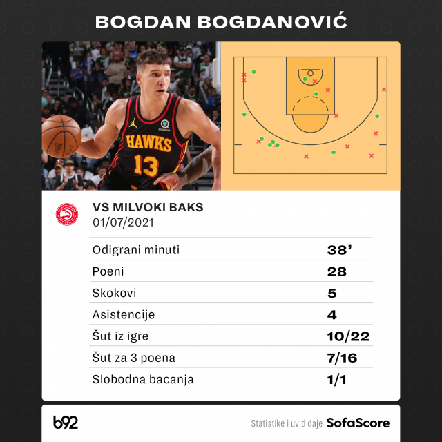 Kod Atlante najefikasniji je bio Bogdan Bogdanović sa 28 poena (10/22) uz pet skokova i četiri asistencije. Srpski as ubacio je sedam trojki i nijednom nije izgubio loptu tokom meča.