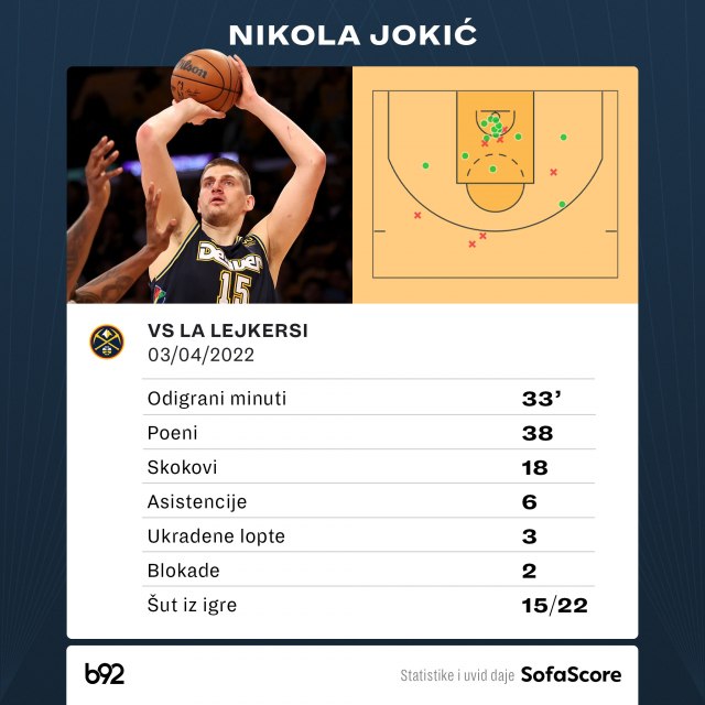 Nije baš najbolje otvorio meč Jokić. Već nakon prvih 12 minuta je "prodao" pet lopti, a na kraju je imao sedam izgubljenih uz tri ukradene i dve blokade. Rano je ušao u problem sa faulovima. Još pre poluvremena je imao tri lične greške, samo da do kraja meča ne bi napravio niti jednu.