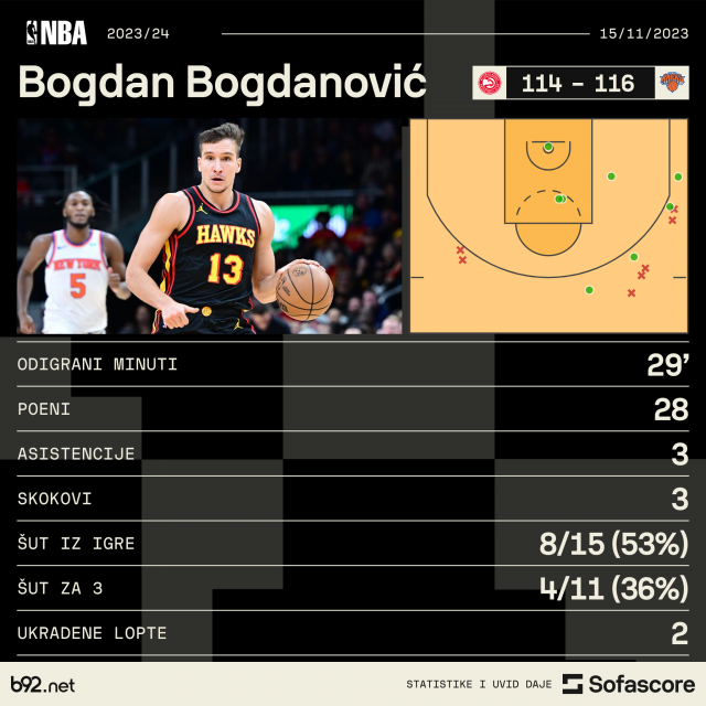 Imao je 28 poena (8/15 iz igre, 4/11 za tri, 8/8 penali), tri asistencije, tri skoka, dve ukradene lopte i jednu blokadu.