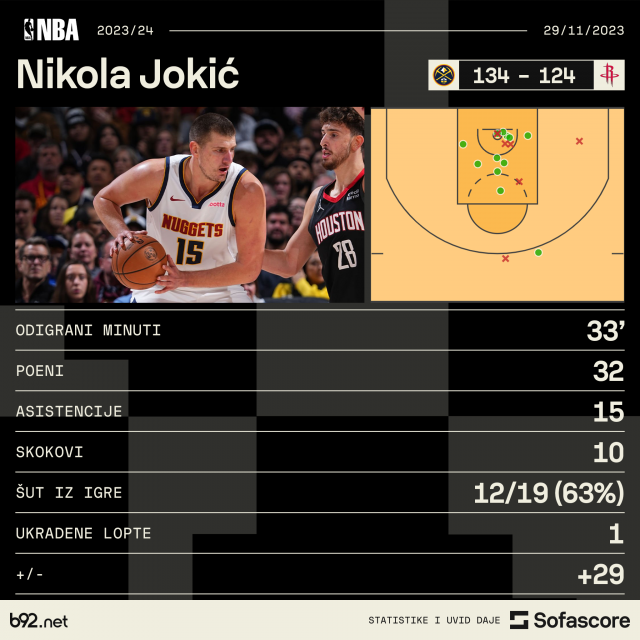 Jokić je uz sebe imao napadački izuzetno raspoloženog Majkla Portera Džuniora koji je doprineo sa 30 poena - i sedam ubačenih trojki.