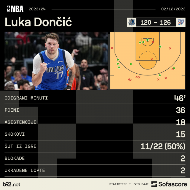 Neverovatan preokret Dalasa, koji na kraju nije bio dovoljan, je predvodio Luka Dončić koji je meč završio sa statistikom na koju smo navikli od Nikole Jokića. Slovenački košarkaš je ostvario tripl-dabl sa 36 poena, 18 asistencija i 15 skokova.