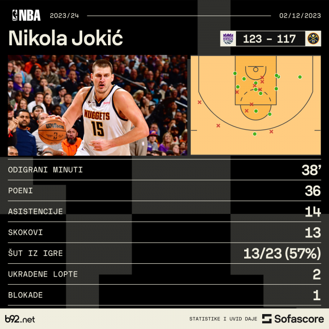Jokić je protiv KIngsa ostvario tripl-dabl u kom je postigao 36 poena, imao 13 skokova i 14 asistencija.