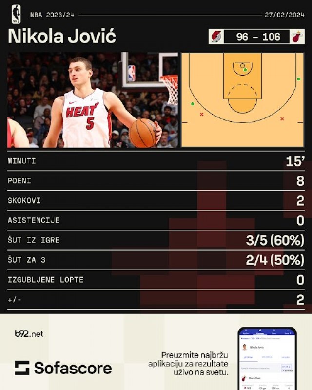 Jović je odigrao 15 minuta i upisao je osam (3/5 šut iz igre) poena i dva skoka.