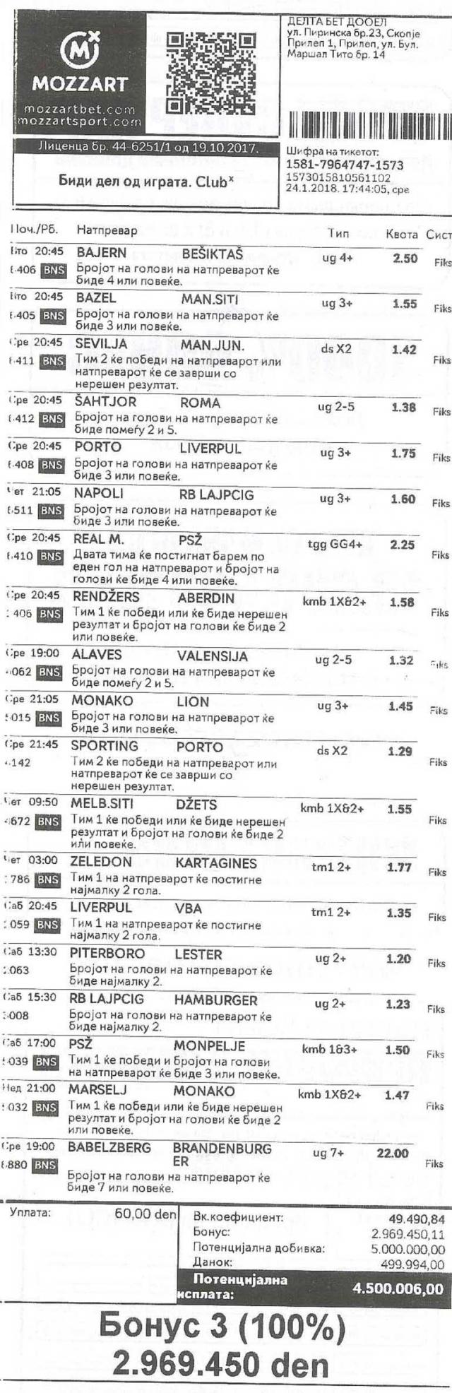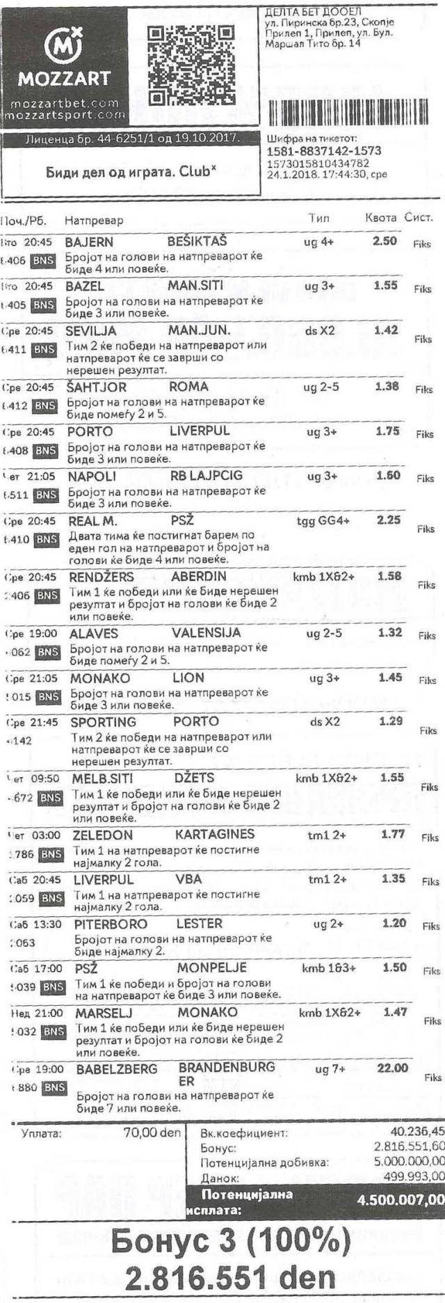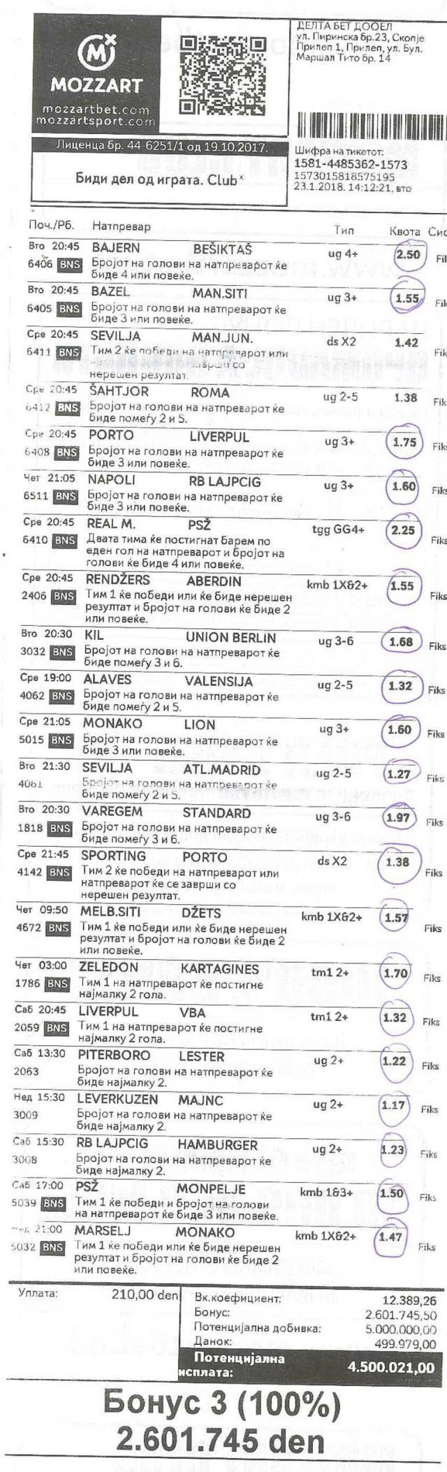 Ukupno je na sedam tiketa uplatio 910 denara, dakle nešto više od 1.700 dinara, odnosno oko 15 evra. A u sredu, kada su završeni mečevi Lige šampiona, trebalo mu je dosta da se prebroji: na šest tiketa dobio je po PET MILIONA DENARA, dakle po više od 81.000 evra, što ukupno iznosi oko 490.000 evra, a na jednom je naplatio 4.632.342 denara, odnosno više od 75.000 evra, što ukupno iznosi 565.000 EVRA!