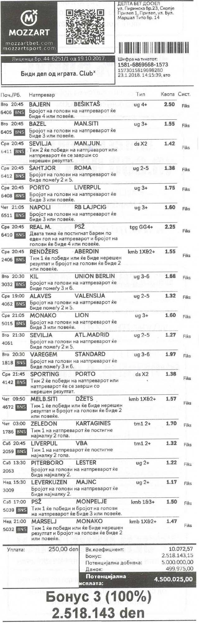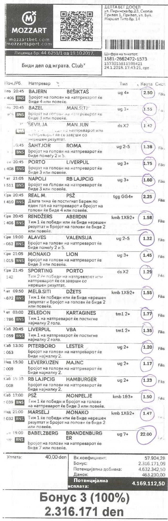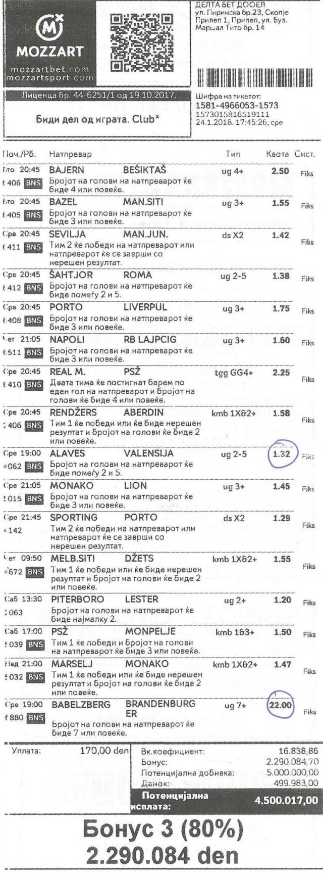 Ukupno je na sedam tiketa uplatio 910 denara, dakle nešto više od 1.700 dinara, odnosno oko 15 evra. A u sredu, kada su završeni mečevi Lige šampiona, trebalo mu je dosta da se prebroji: na šest tiketa dobio je po PET MILIONA DENARA, dakle po više od 81.000 evra, što ukupno iznosi oko 490.000 evra, a na jednom je naplatio 4.632.342 denara, odnosno više od 75.000 evra, što ukupno iznosi 565.000 EVRA!