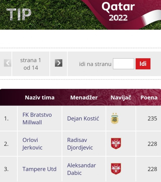 Lider igre Tip je Dejan Kostić koji je "zablistao" u trećem kolu pogodivši četiri tačna rezultata na utakmicama Kanada – Maroko (1:2), S. Arabija – Meksiko (1:2), Poljska — Argentina (0:2) i Holandija –Katar (2:0).