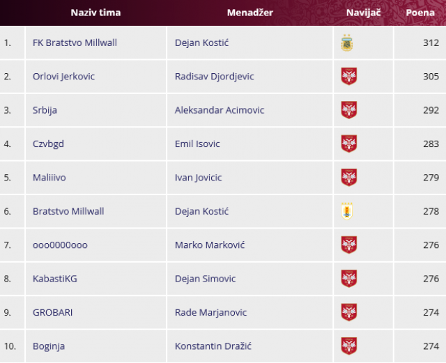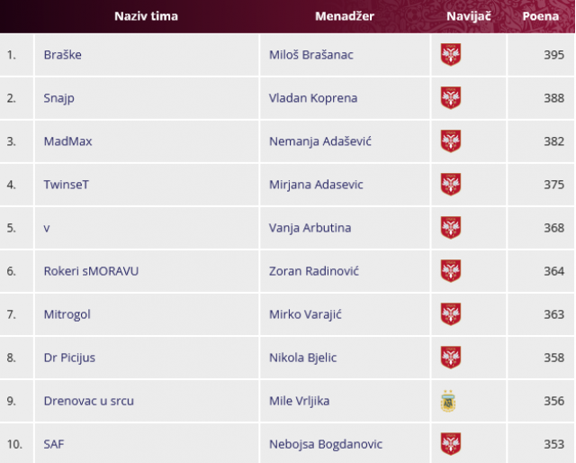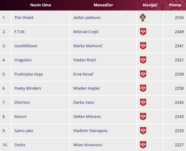 Na kraju, u igri "Pogodi 11", u kojoj ste predviđali startne postave, titulu iz Rusije 2018. odbranio je Stefan Petković sa "The Shield" i 2.530 poena.