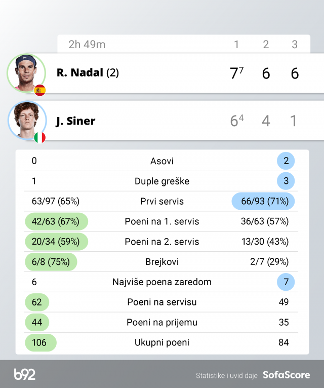 Nadal je savladao Italijana Janika Sinera 7:6 (5), 6:5, 6:1 i bez izgubljenog seta stigao do četiri najbolja tenisera na trećem Grend slemu sezone.
