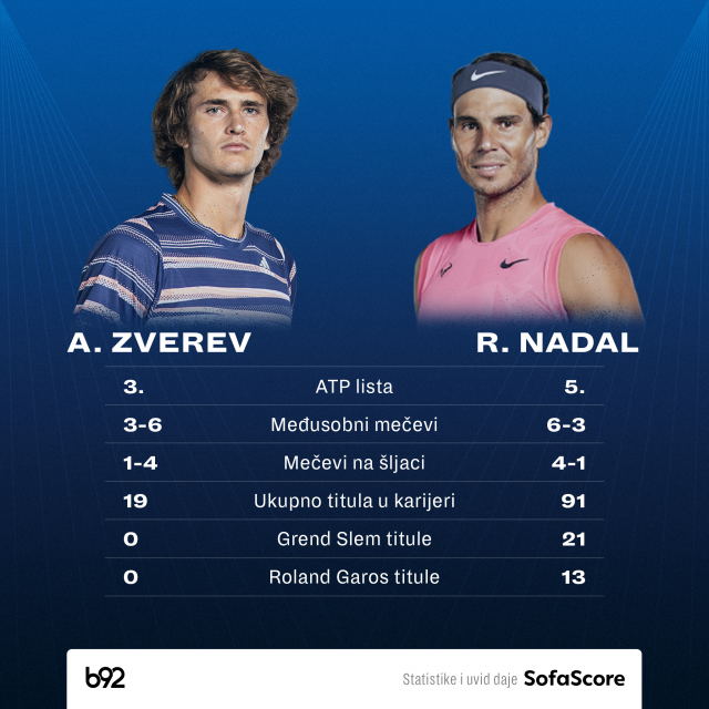 Nadal i Zverev se sastaju jubilarni deseti put, a Španac vodi 6-3. Poslednja dva duela imali su prošle godine kada su obojica slavili na po jednom Mastersu na šljaci, Zverev u Madridu, a Nadal u Rimu.