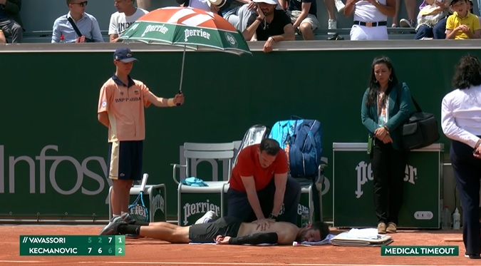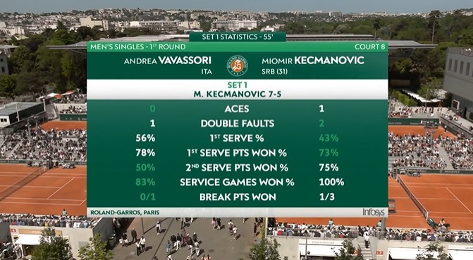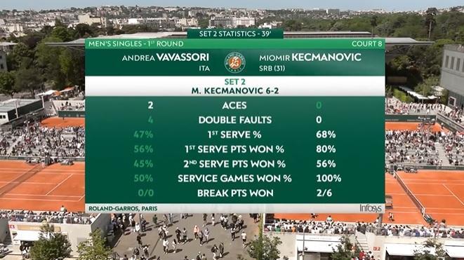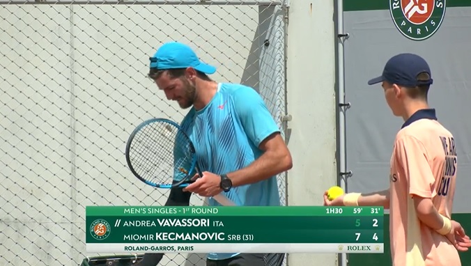 Miomir Kecmanović je poražen od Italijana Andree Vavasorija u prvom kolu na Rolan Garosu sa 5:7, 2:6, 7:6 (8), 7:6 (3), 7:6 (9).