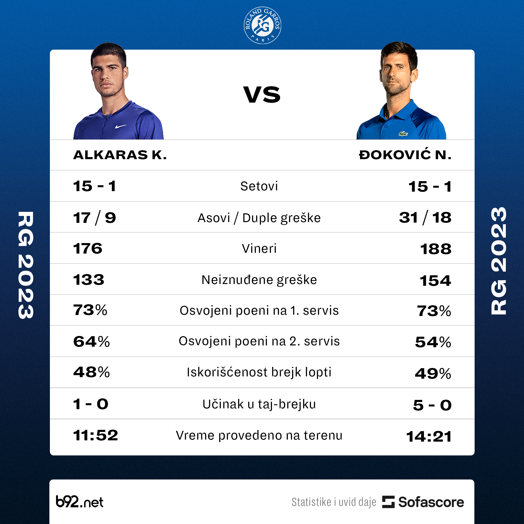 Novak Đoković je u polufinalu Rolan Garosa pobedio Karlosa Alkarasa sa 6:3, 5:7, 6:1, 6:1
